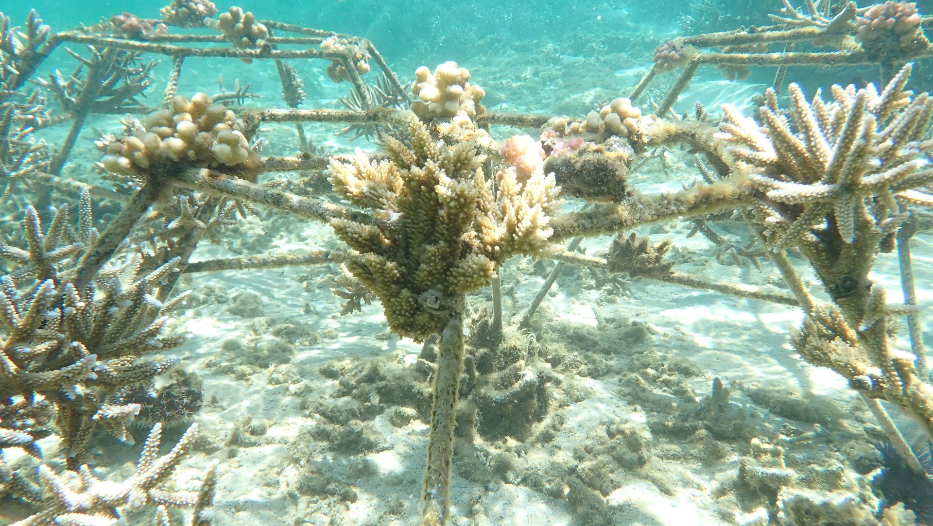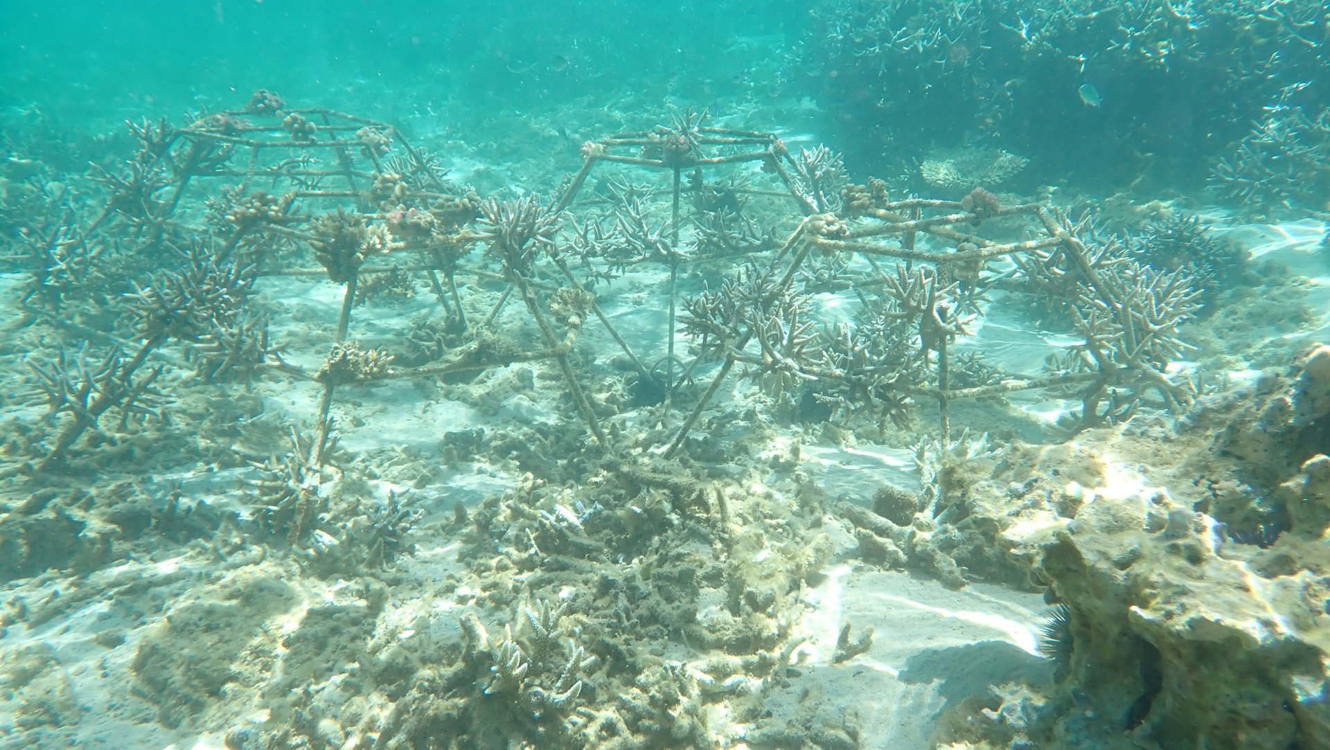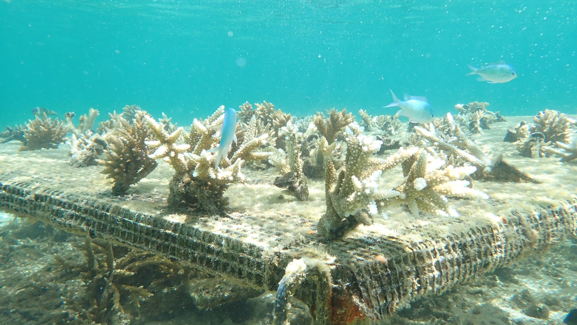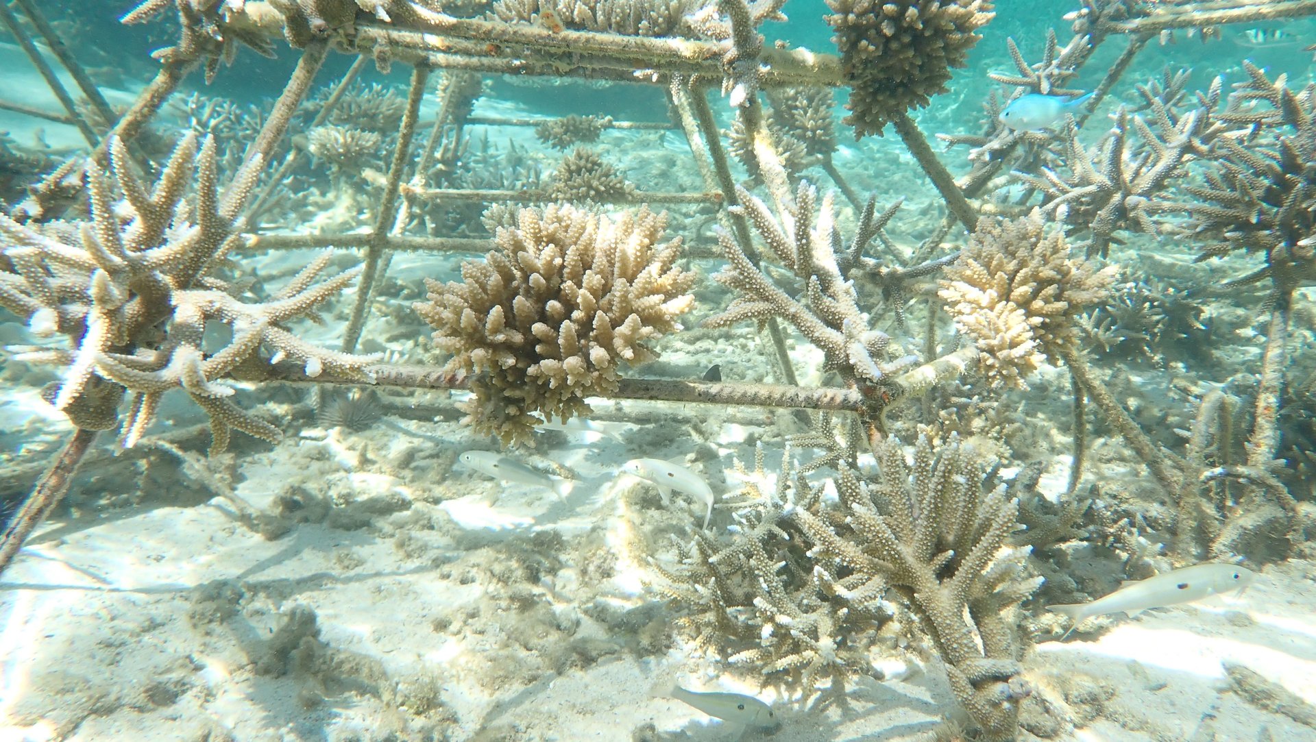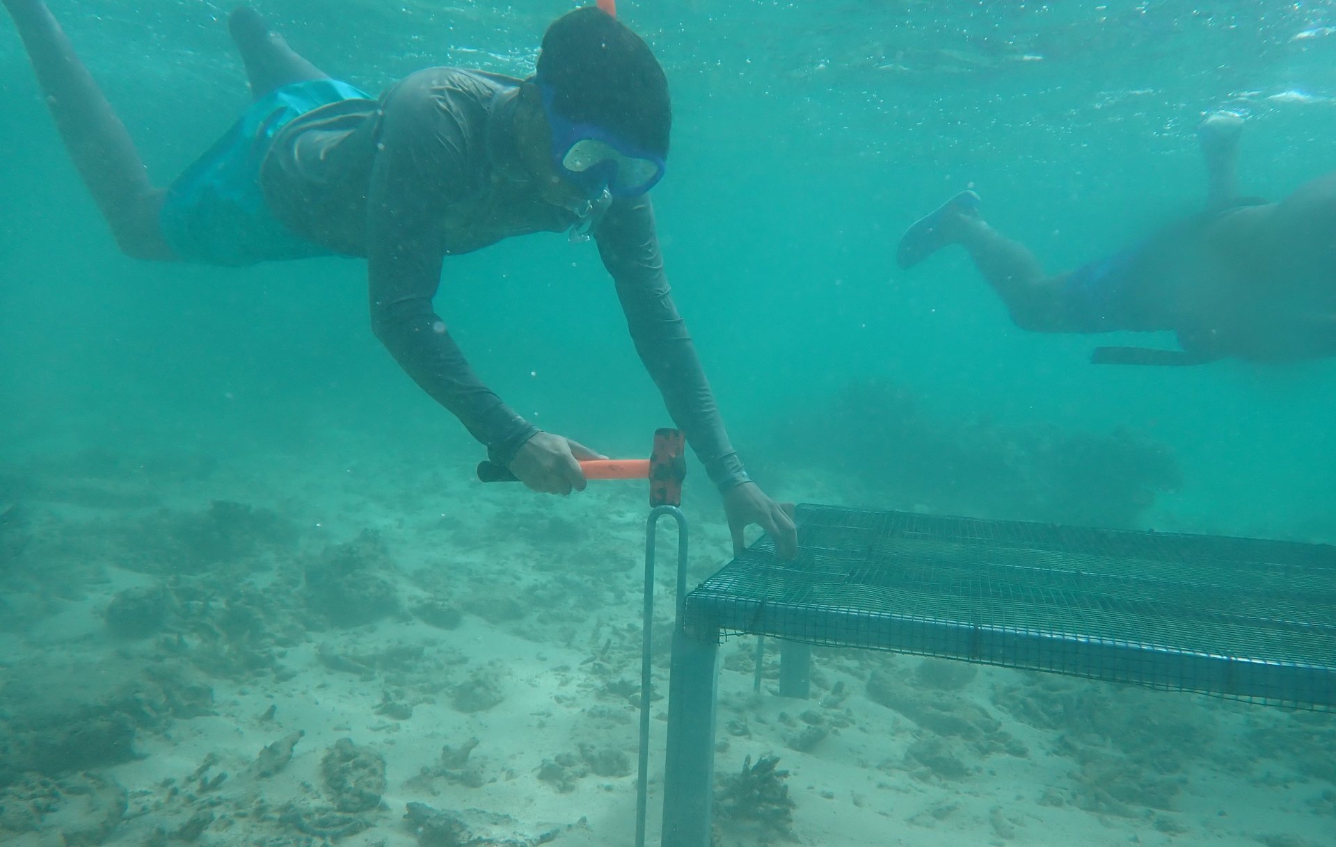 The project centred on innovative coral restoration techniques to maximise success rates while fostering community engagement. CGC established two operational coral farms, where COPs—coral fragments broken off due to human activity or natural disturbances—were collected, fragmented, and prepared for transplantation. These corals were acclimatised in nurseries before being transplanted onto degraded reef sites using various techniques, including attachment with epoxy, plastic nails, and spider-frame structures. Additionally, the project incorporated community involvement, training five local fishers in coral restoration techniques. Beyond direct participants, over 50 community members from St. Felix and Rivieres de Galets were sensitised on coral reef conservation through awareness programs. To ensure long-term impact, CGC has set up two dedicated monitoring stations to track coral growth, survival rates, and fish biodiversity improvements in restored areas.