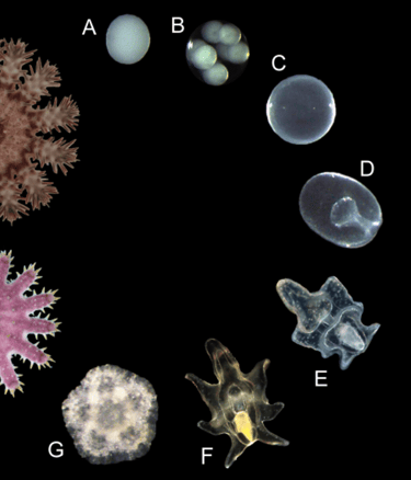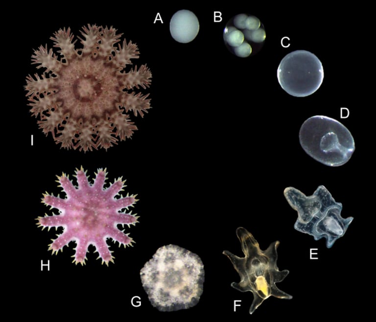 The life cycle of a crown of thorns starfish (Source: Deaker and Byrne 2022). (A) an unfertilised egg, (B) the eight-cell stage, (C) a blastula, (D) a gastrula with the archenteron, (E) a feeding bipinnaria with fully developed digestive tract (F), a brachiolaria with anterior arms used for benthic settlement, (G) a newly settled juvenile, (H) the older herbivorous stage juvenile and, finally, (I) the corallivorous stage.